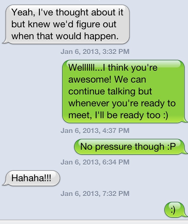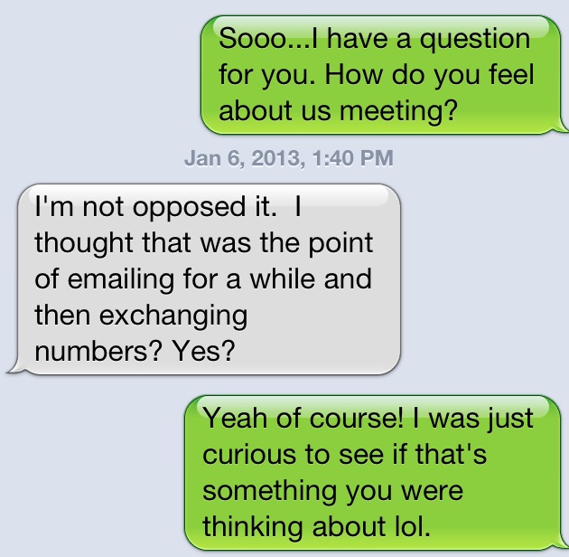 There have been new developments with Mr. Calm and Collected. We still haven’t met. I attempted to bring up us meeting in person and I failed miserably. I’m generally a very open person and very comfortable speaking my mind; however, when it comes to guys (I like)…I get very awkward. I don’t know why that is but it’s been like this for as long as I can remember. Anyways, here’s how our conversation went down:
